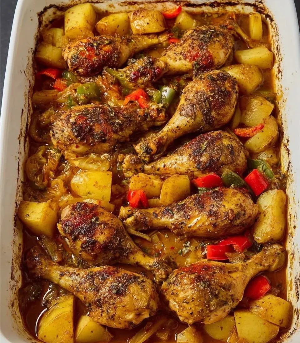 This easy one-pan meal features juicy, seasoned chicken drumsticks roasted with golden potatoes, sweet bell peppers, and aromatic herbs. It’s weeknight comfort food that’s satisfying, colorful, and made to impress with minimal effort.
