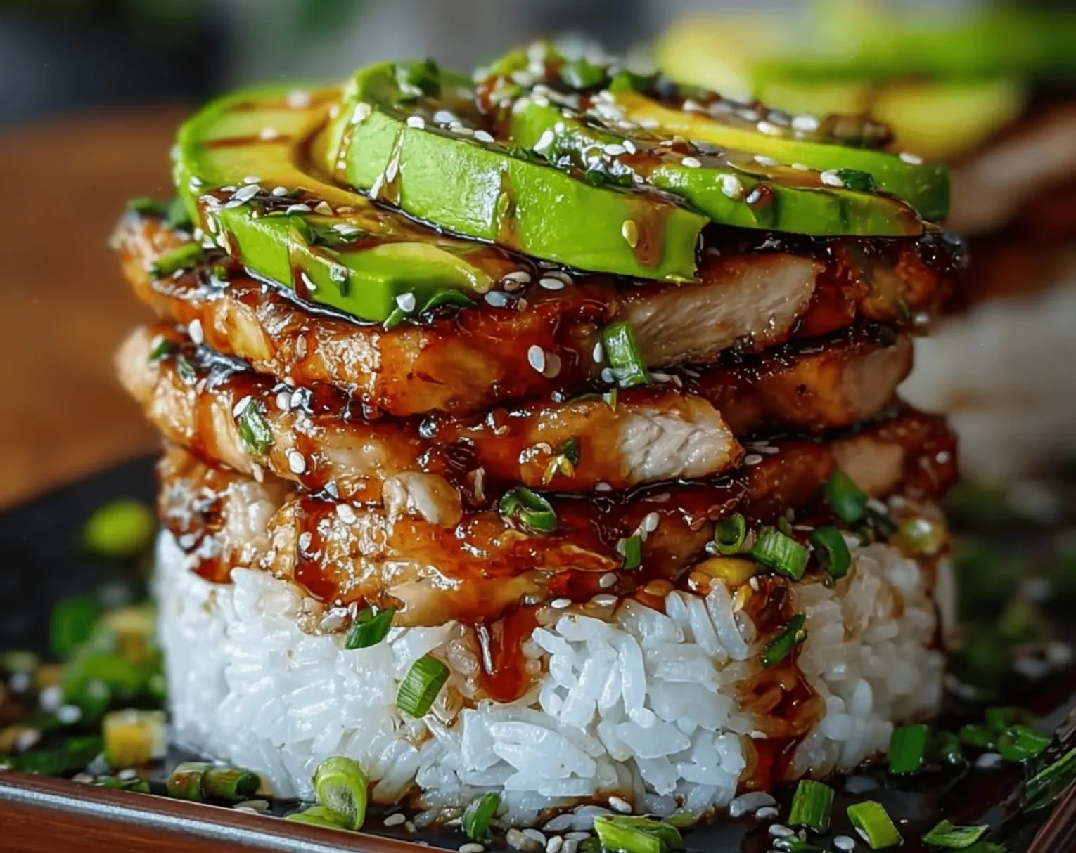 This layered bowl-style meal features sweet-savory teriyaki chicken, mashed avocado, and sesame-kissed rice—perfect for meal prep or an impressive light lunch that’s gluten-free and easy to modify.