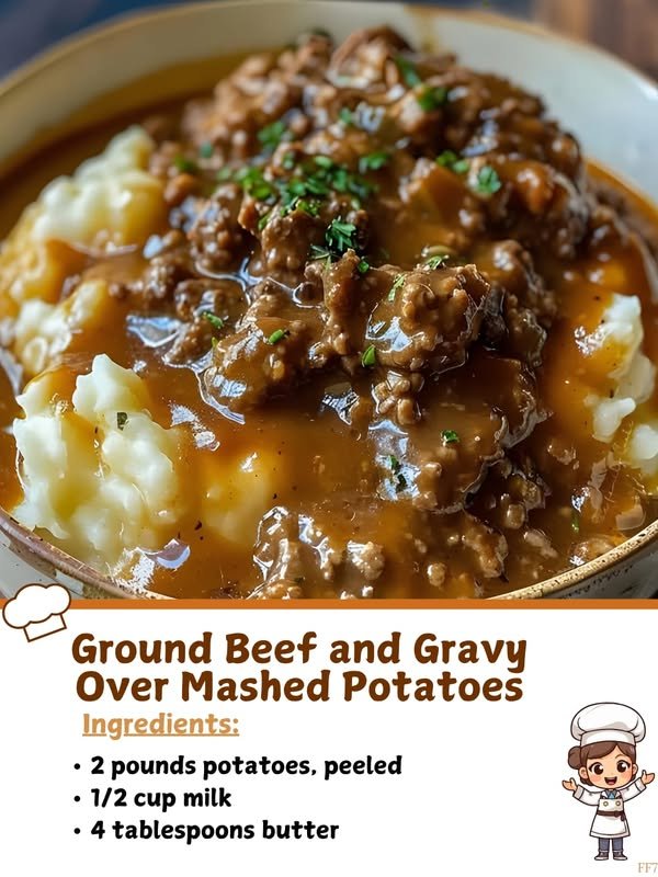A hearty, comforting meal featuring creamy mashed potatoes topped with savory beef and onion gravy — perfect for weeknights or cozy weekends.