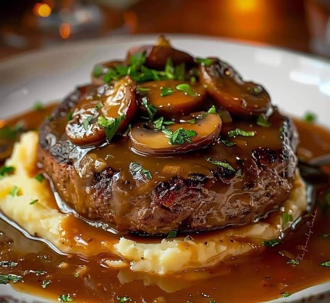 Serve the Salisbury steaks with a generous helping of garlic mashed potatoes and top with the mushroom and onion gravy.