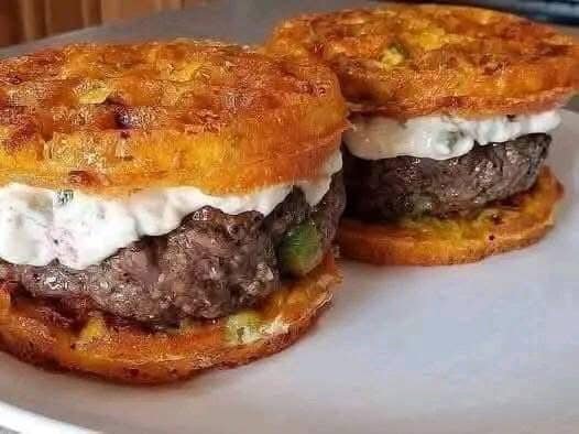 - Layer with lettuce, tomato, the cooked patty, and top with another waffle.