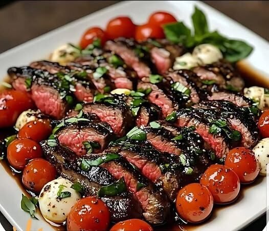 Arrange the sliced steak on a serving platter and top it with the tomato and mozzarella mixture. Drizzle with balsamic glaze and serve immediately.