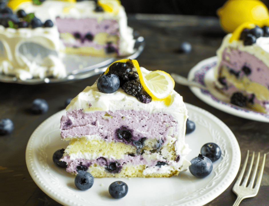 - Slice your Blueberry Lemon Creme Cake to serve.