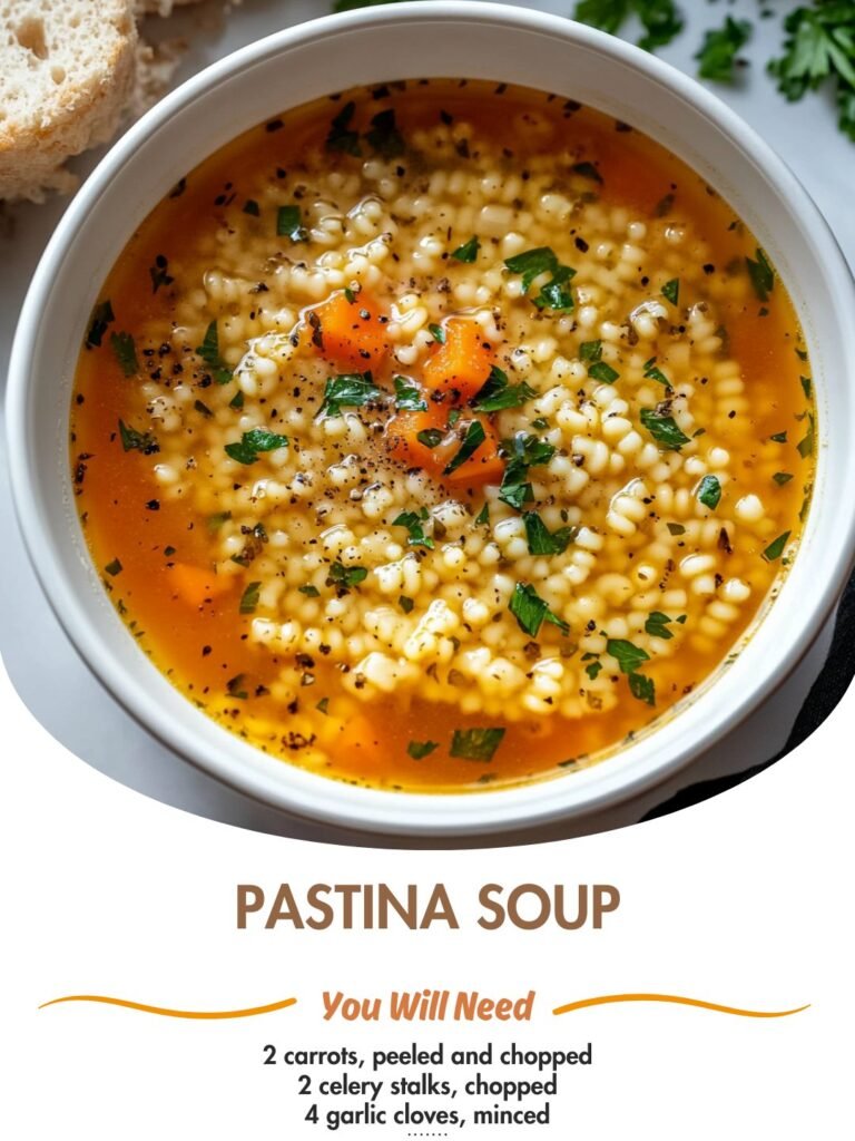 Ingredients:2 carrots, peeled and chopped2 celery stalks, chopped4 garlic cloves, minced1 cup pastina (tiny star-shaped pasta or other small pasta shapes)1 medium yellow onion, chopped6 cups low-sodium chicken or vegetable …