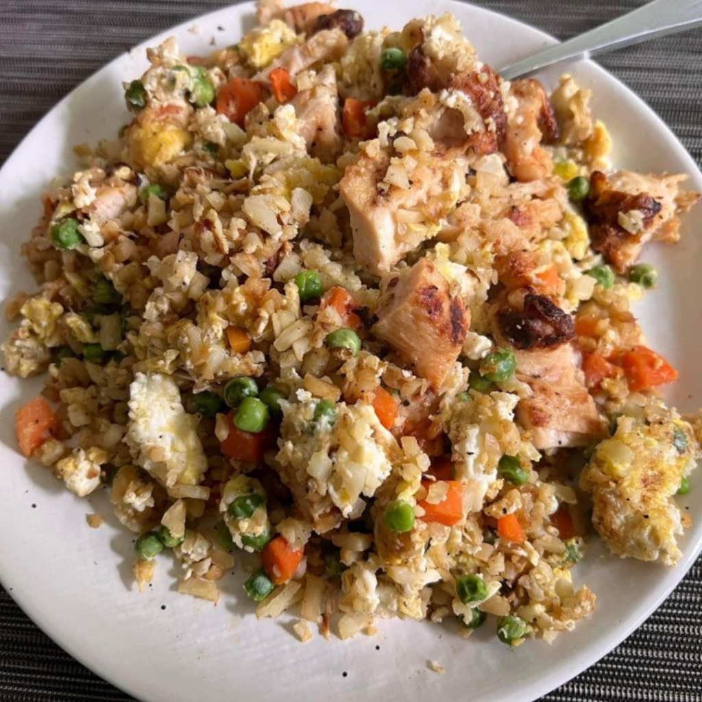 Frozen Tyson Grill Ready Chicken Breast Fillet (1 breast) 1 cup cauliflower rice 1/2 cup carrots and peas 2 eggs Spray Butter Salt (to taste) Pepper (to taste) Garlic Powder …