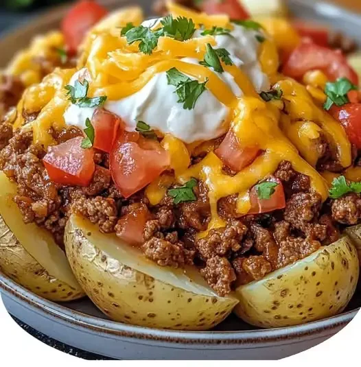 Crispy-skinned baked potatoes loaded with seasoned taco meat, melted cheese, and all your favorite fresh toppings.