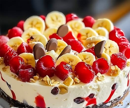 Top the cheesecake with banana slices, maraschino cherries, crushed pineapple, and a drizzle of chocolate syrup.