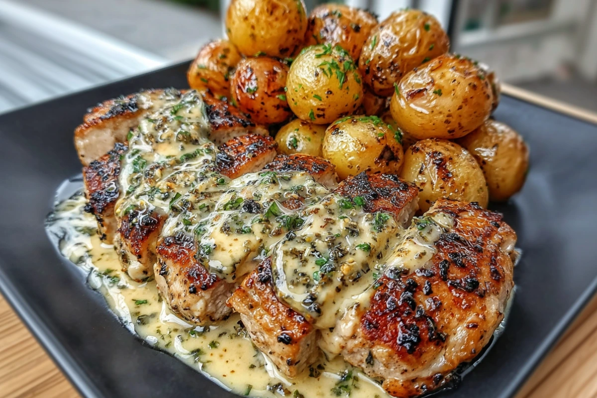 Juicy chicken breasts smothered in a creamy garlic sauce served with crispy roasted baby potatoes—simple, satisfying, and full of flavor.