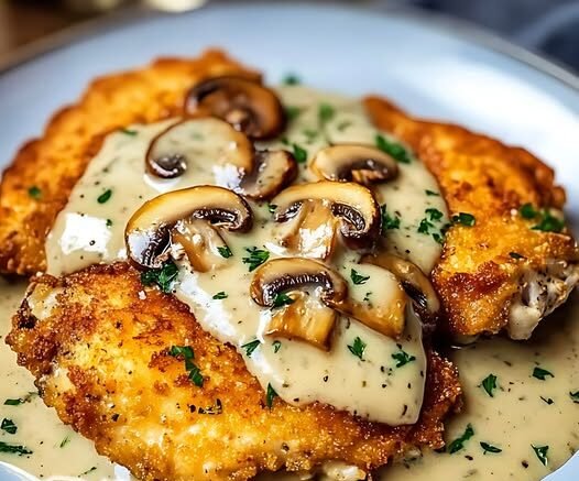 Crispy Golden Chicken with Creamy Parmesan Mushroom Sauce