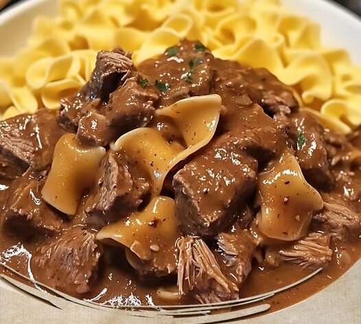 Once the beef is tender and the sauce has thickened, serve the beef tips over the cooked egg noodles.