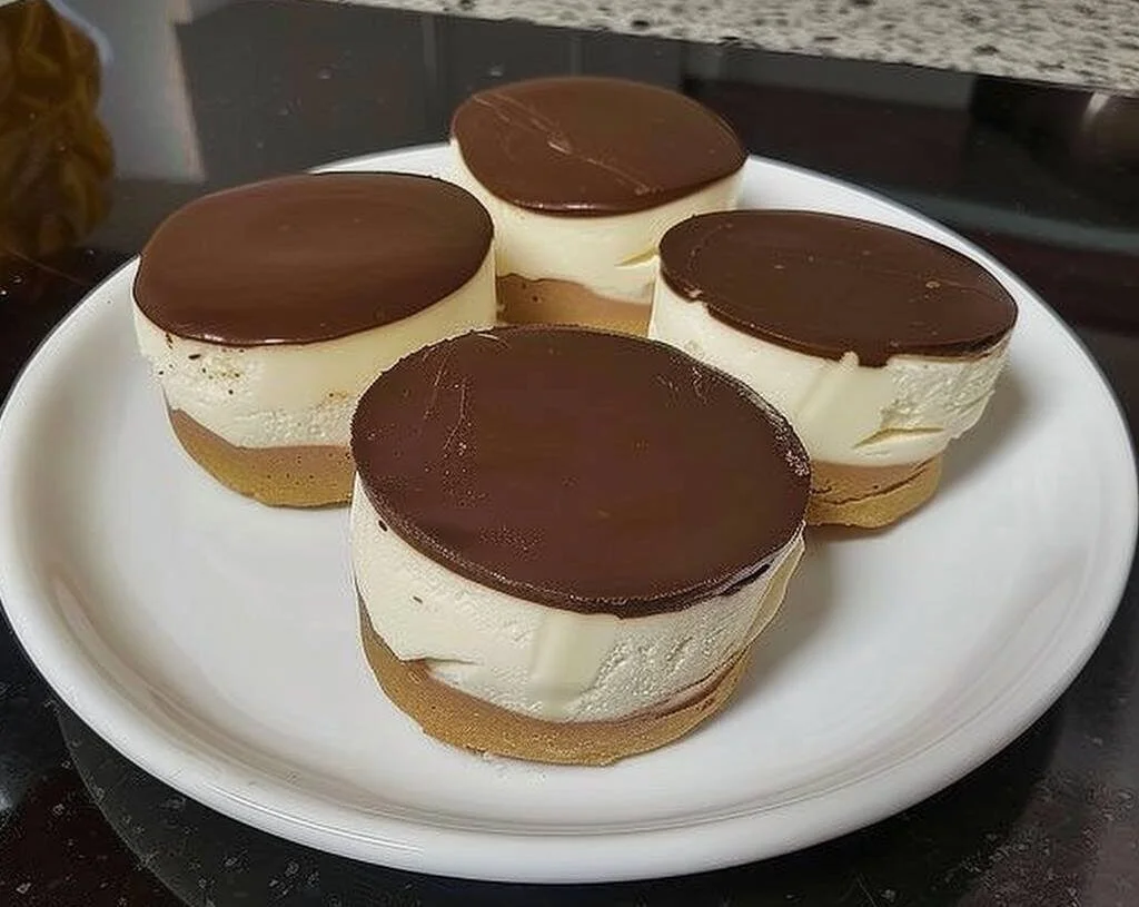 After the filling is spooned into each mold, place the tray in the freezer and allow the cheesecake base to freeze for about 20 minutes, or until it is firm to the touch. This helps create a solid layer that will hold up when you add the chocolate layer.