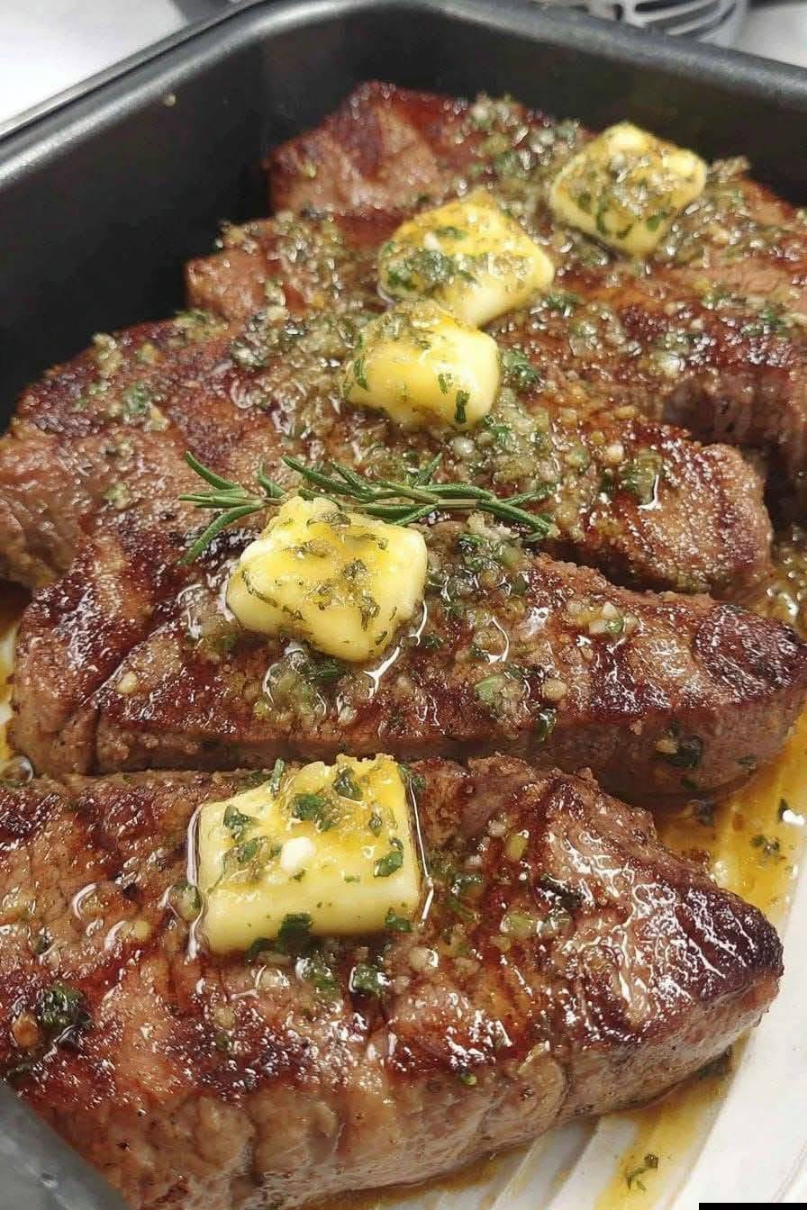 While steaks cook, mix softened butter with garlic, parsley, salt, and optional lemon juice.