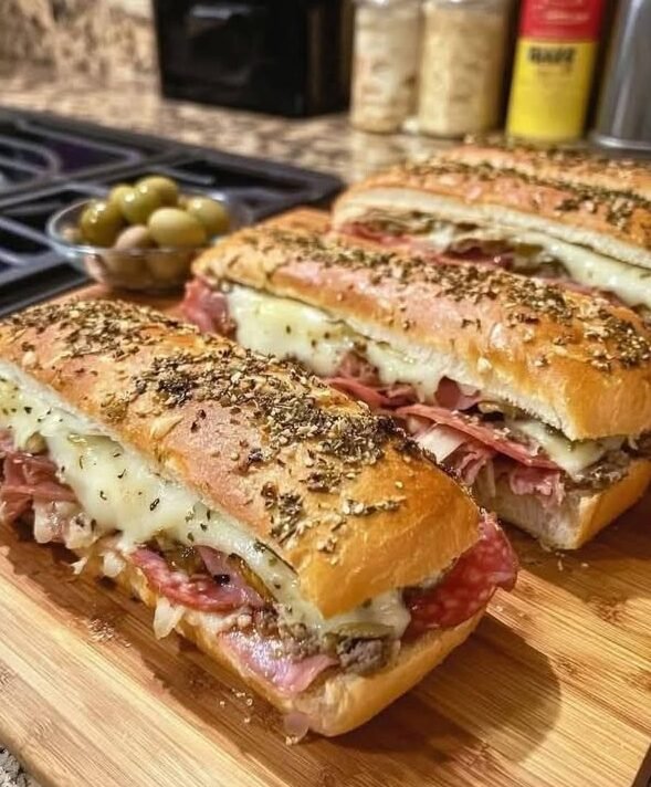 The Muffaletta is a legendary sandwich born in New Orleans, traditionally made with a large round Italian loaf and filled to the brim with deli meats, cheeses, and a savory olive salad. This giant version is ideal for parties, game days, or picnics—each slice is rich, salty, tangy, and satisfying.