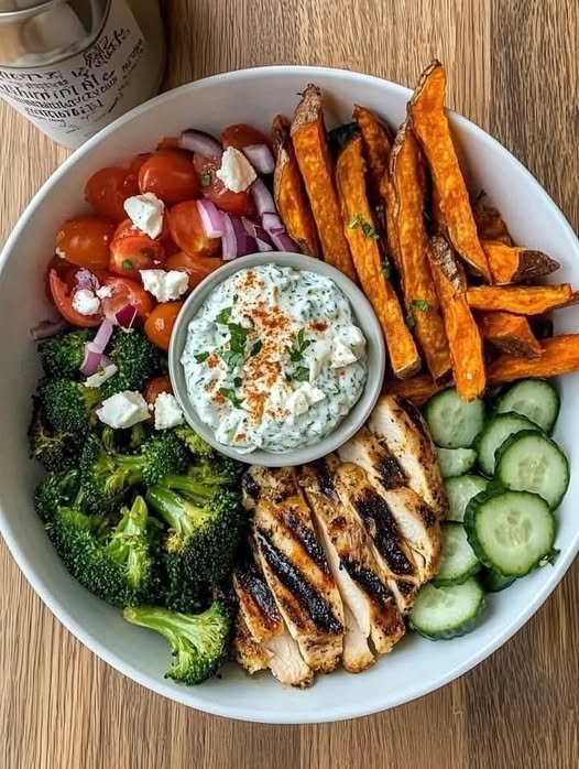 Arrange grilled chicken, broccoli, cherry tomatoes, red onion, cucumbers, and fries in a deep bowl. Add crumbled feta on top for big flavor energy.
