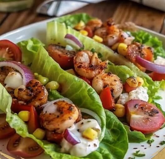 Lay out the lettuce leaves. Add a spoonful of avocado mash, a generous portion of salad, a few shrimp, and a drizzle of lime yogurt sauce on each leaf.