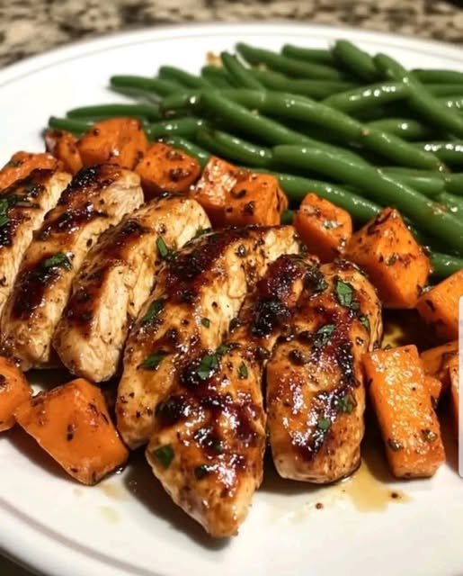 Remove sweet potatoes from the oven. Push them to one side, add marinated chicken and trimmed green beans to the sheet. Drizzle remaining marinade over the chicken.