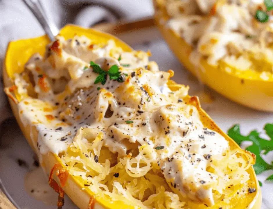 Keto Squash Boats stuffed with Alfredo chicken is a rich and indulgent dish. This dish is made with shredded chicken, which is tossed in Homemade Alfredo Sauce made with garlic, cream, butter, and Parmesan cheese, which is stuffed in low-carb Spaghetti squash, and it is topped with mozzarella cheese and then baked to form the golden crust. These Keto Squash Boats stuffed with Alfredo chicken are filled with proteins and healthy fats, and it is low in carbs as well, so they are perfect for a keto diet. We can easily customize it with additional vegetables, spices, and protein. This dish stores well, so we can also prepare it for meal prep.