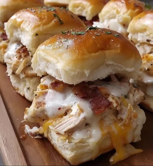 Spread the chicken mixture evenly over the bottom half of the rolls in the baking pan. Sprinkle shredded cheddar cheese over the chicken mixture.