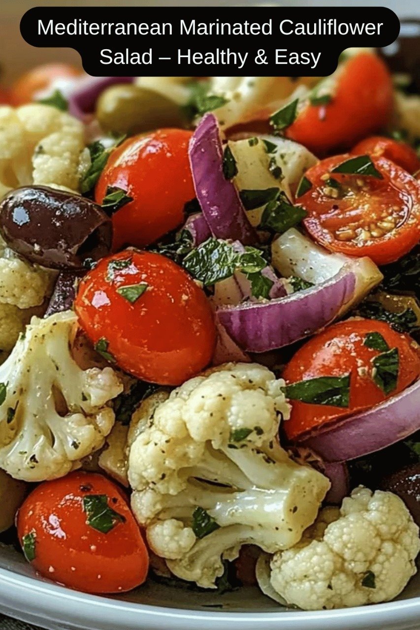 In a large bowl, combine the cauliflower, onion, cherry tomatoes, cucumber, olives, and roasted red peppers.