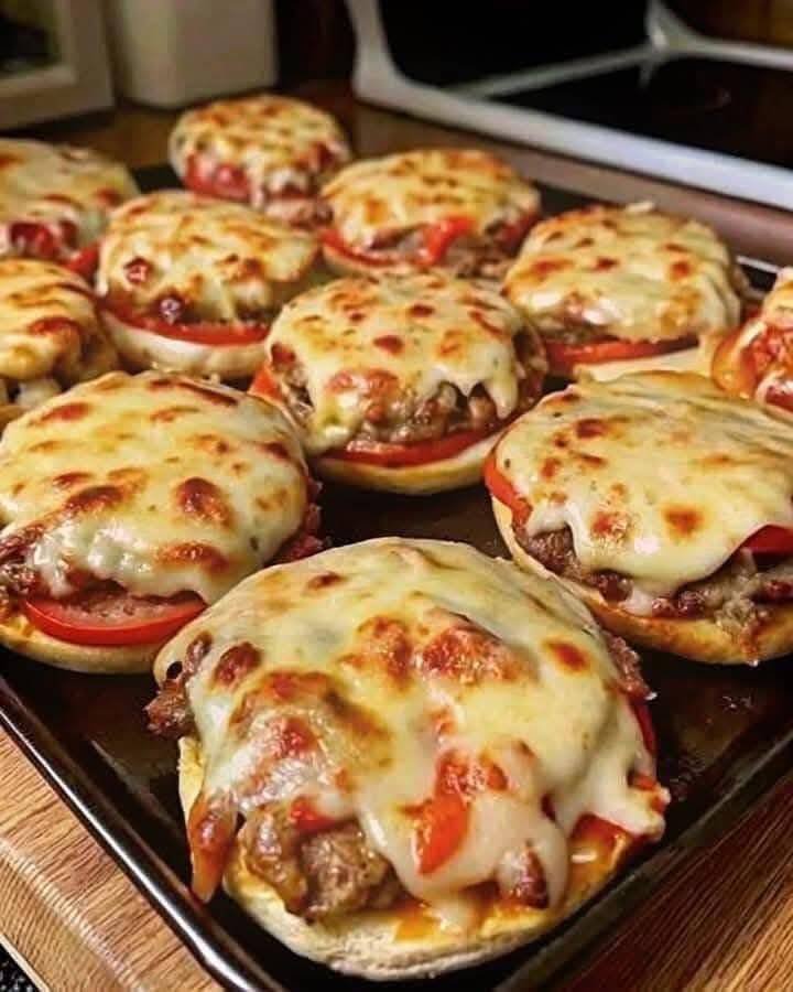 7. Place the assembled burgers on a baking tray and bake for 5–7 minutes, or until the cheese is melted and bubbly.