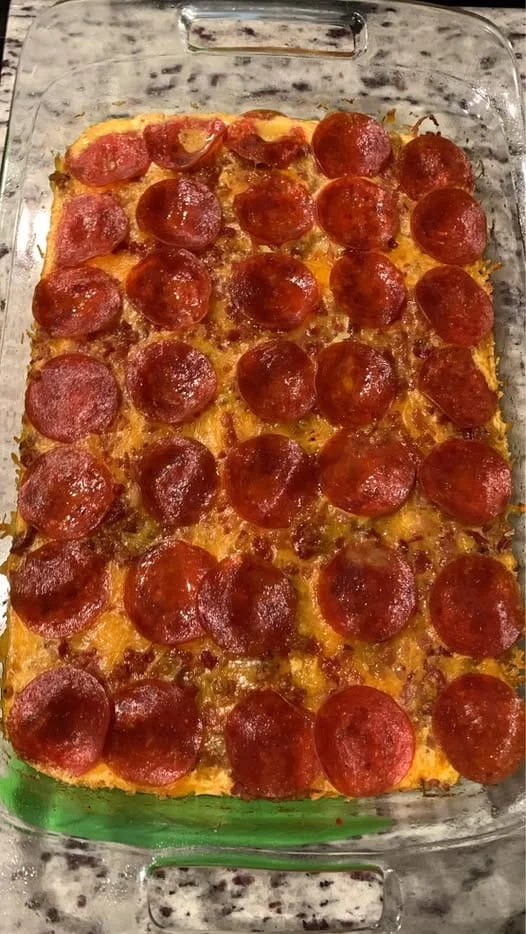 Brown ground beef with avocado oil. Place in a greased 9ā x 13ā baking dish. Beat 8 eggs & mix in hot sauce to taste. Pour eggs evenly over ground beef. Sprinkle taco seasoning evenly over ground beef & eggs. Evenly spread shredded cheddar over dish. Evenly spread bacon bits over dish. Place pepperonis on top (7 rows of 5). Place in preheated oven at 350 degrees for 20 minutes. Enjoy!