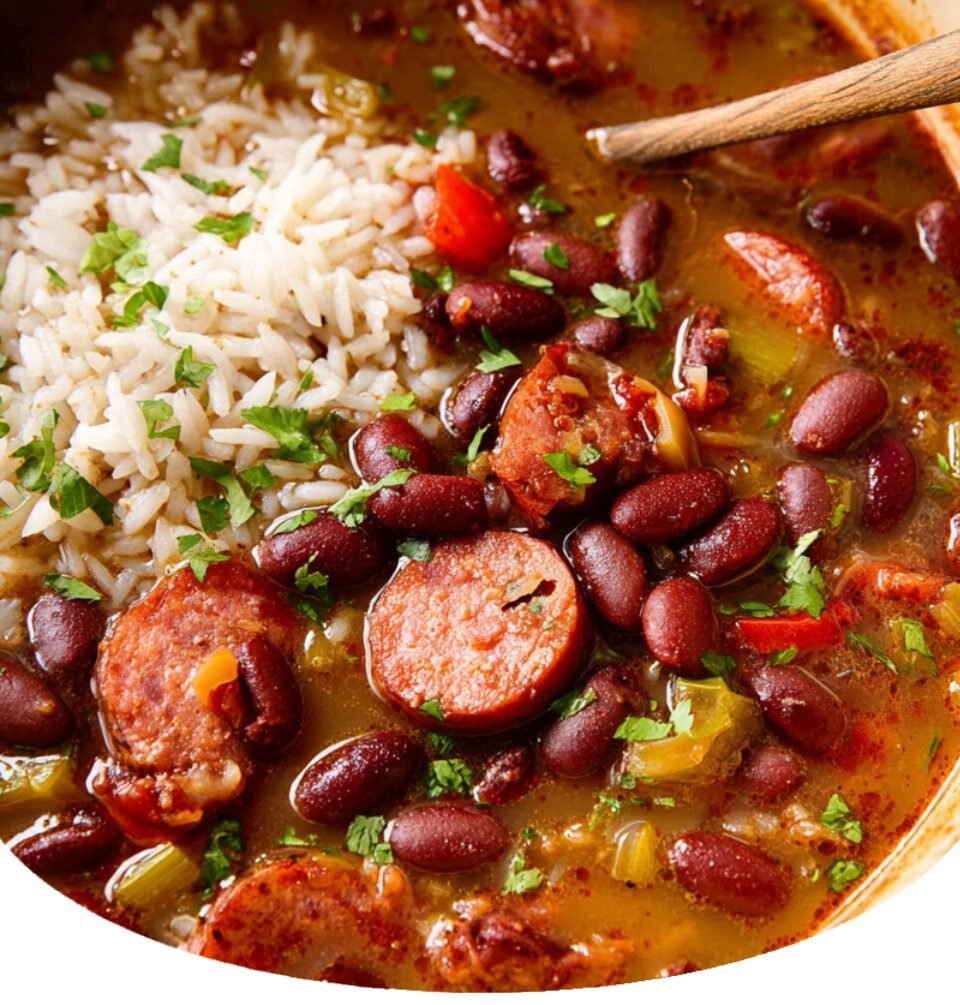 Spicy andouille sausage and tender beans in a flavorful stew, served over fluffy rice for true Southern comfort.