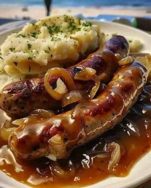 Spoon creamy mash onto plates, top with sausages, and generously ladle over the onion gravy.