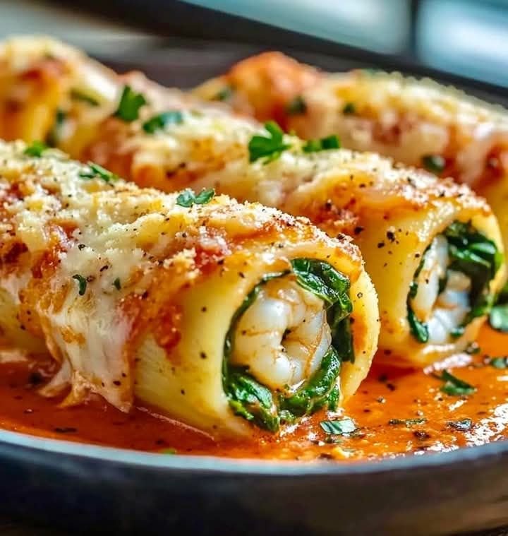 Shrimp and Spinach Stuffed Pasta Rolls with Roasted Red Pepper Cream