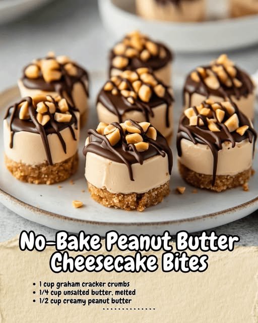 : 🥜 Peanut Butter Cheesecake Bites Mini no-bake treats with a graham-cracker base, ultra-creamy PB cheesecake filling, and optional chocolate-peanut crunch on top. 📋 Recipe Card Yield Prep Chill Total …