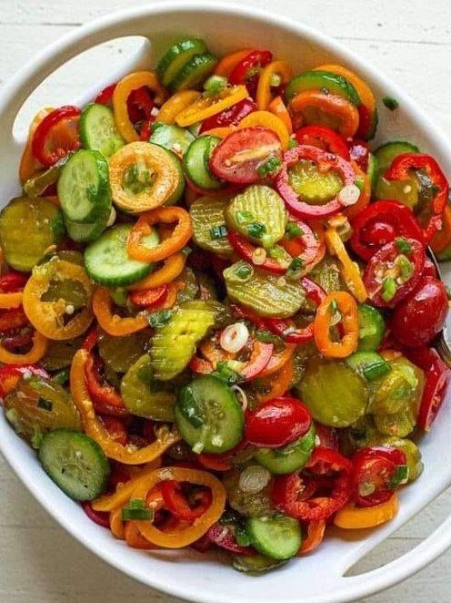 A crisp, punchy salad loaded with fresh veggies, herbs, and a tangy pickle-brine dressing!